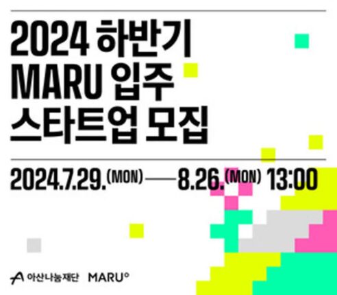 아산나눔재단, 기업가정신 플랫폼 ‘마루(MARU)’ 하반기 입주 스타트업 모집 아산나눔재단(이사장 엄윤미)이 기업가정신 플랫폼 ‘마루(MARU)’에 입주할 스타트업을 7월 29일부터 8월 26일까지 한 달간 모집한다.아산나눔재단이 운영하는 ‘마루’는 스타트업의 성장을 지원하는 인큐베이터로 창업에 필요한 공간 인프라와 네트워크, 교육 등을 폭넓게 지원한다. 마루에는 스타트업 외에도 국내외 벤처캐피털, 액셀러레이터, 창업 지원 기관 등이 2024.07.23