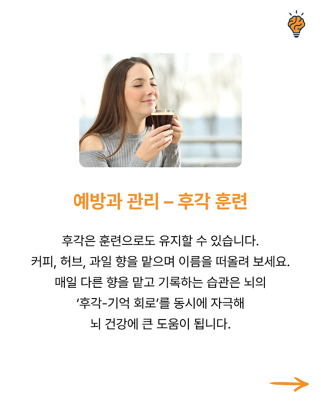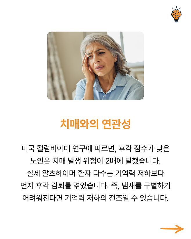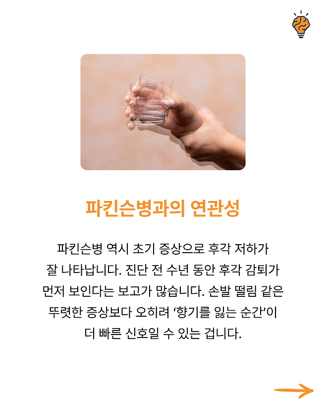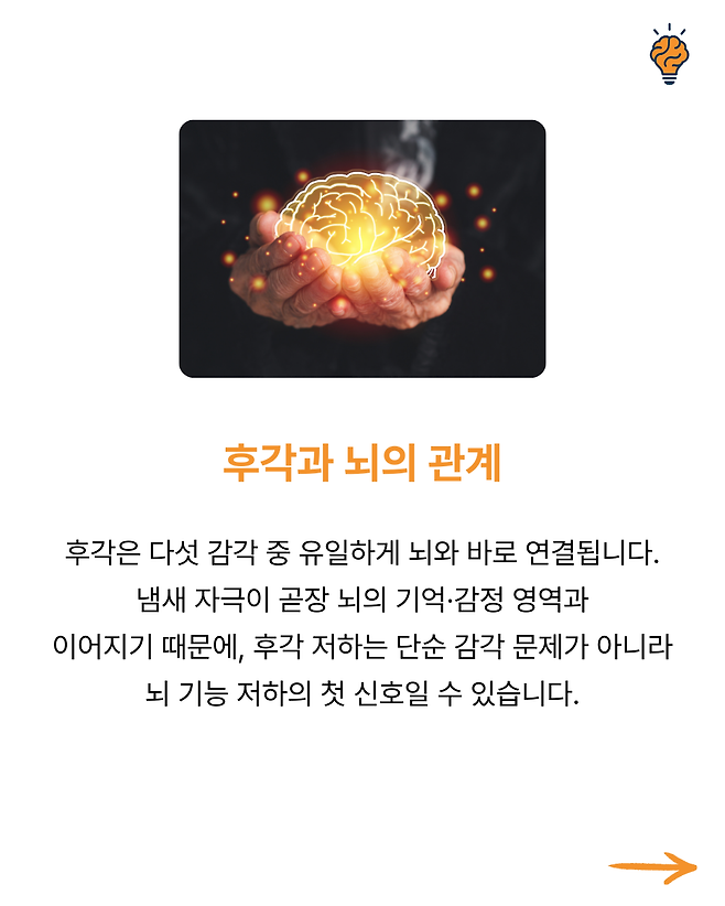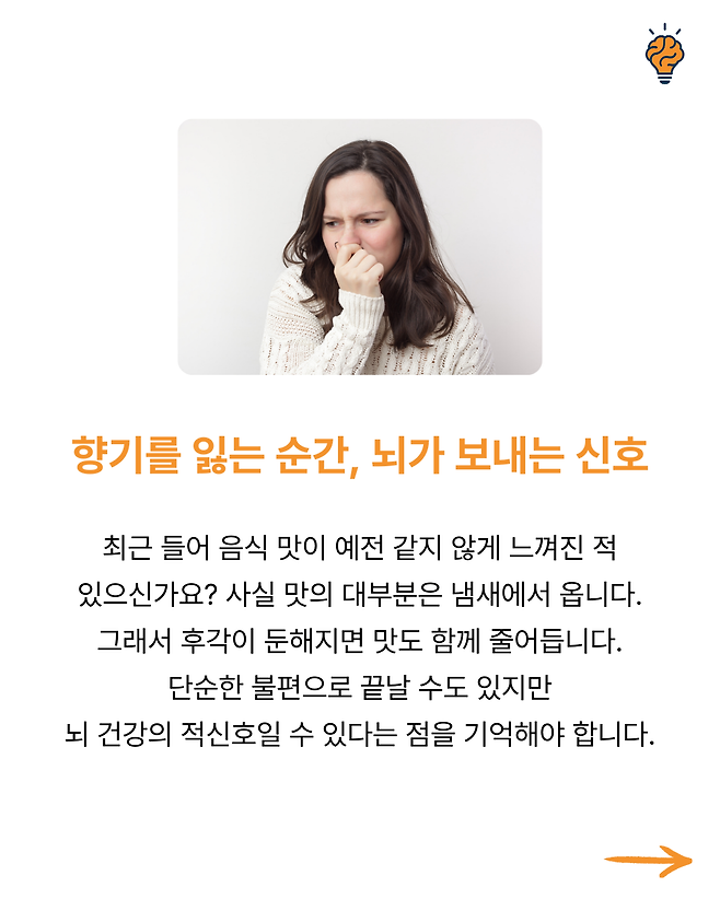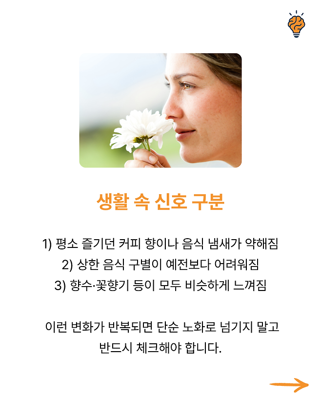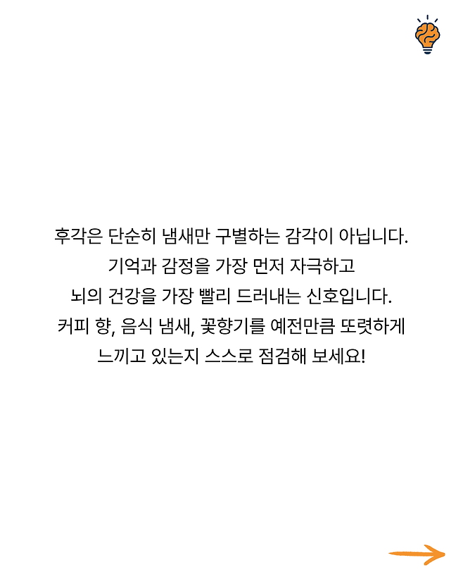 후각이 떨어지는 이유, 단순 노화일까? 뇌 질환의 시작일까? 뇌생각 2025년 09월 19일 오후 09:54 조회수 Post Views: 2 공유 글씨 축소 A 글씨 크기 초기화 글씨 확대 손발이 자꾸 차가워진다면? 뇌혈류 이상 신호일 수 있습니다! “아침 햇빛” 뇌가 가장 좋아하는 보약입니다! 뇌를 살리는 최고의 방법, 하루 10분만 “이것” 읽어보세요! 단순 계산이 헷갈린다면? 뇌 건강 적신호입니다! 몇 개나 맞힐 수 있나요? 1분 기억력 테스트!