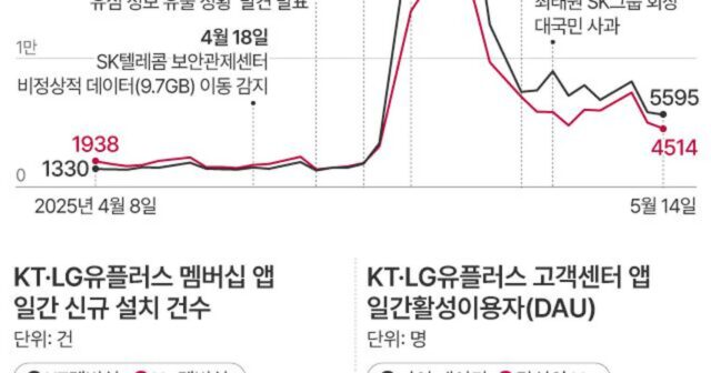 KT·LGU+ ‘고객센터·멤버십’ 앱 사용량·설치 급증… SKT 해킹 ‘풍선효과’? SK텔레콤 해킹 사건 이후 KT와 LG유플러스의 멤버십 앱 설치가 급증하며 고객 이동이 활발해졌다. 신규 가입자가 33만명 이상 증가했다. 2025.05.16