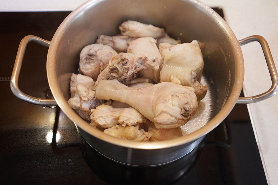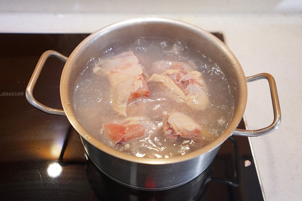 3. 데친 닭은 물에 한번 헹군 후 냄비에 담고 물을 800ml 부어주세요.