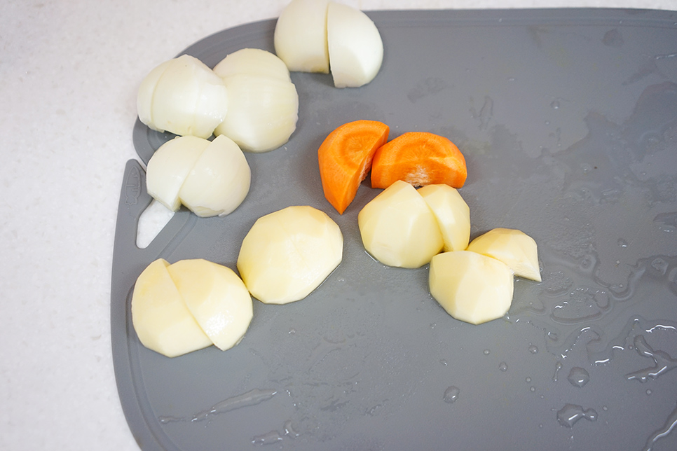 2. 그 동안 채소를 손질해주세요. 저는 양파, 감자, 당근, 대파를 먹기 좋은 크기로 썰어주었습니다.