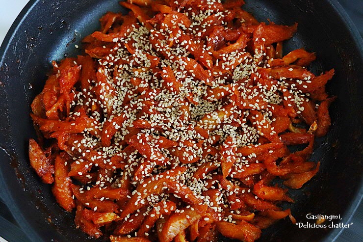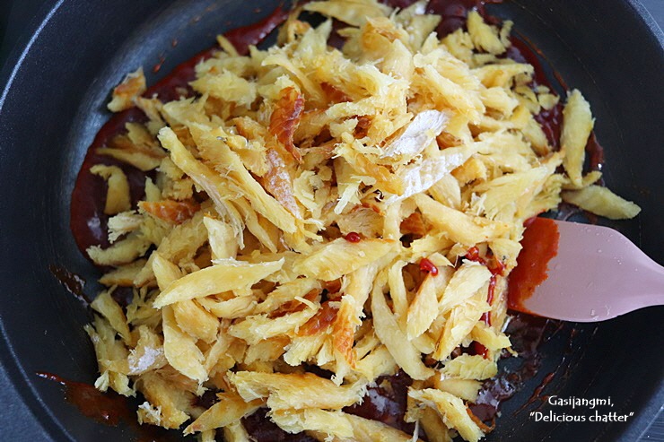 볶아두었던 황태채를 넣고 살살 무쳐주세요.