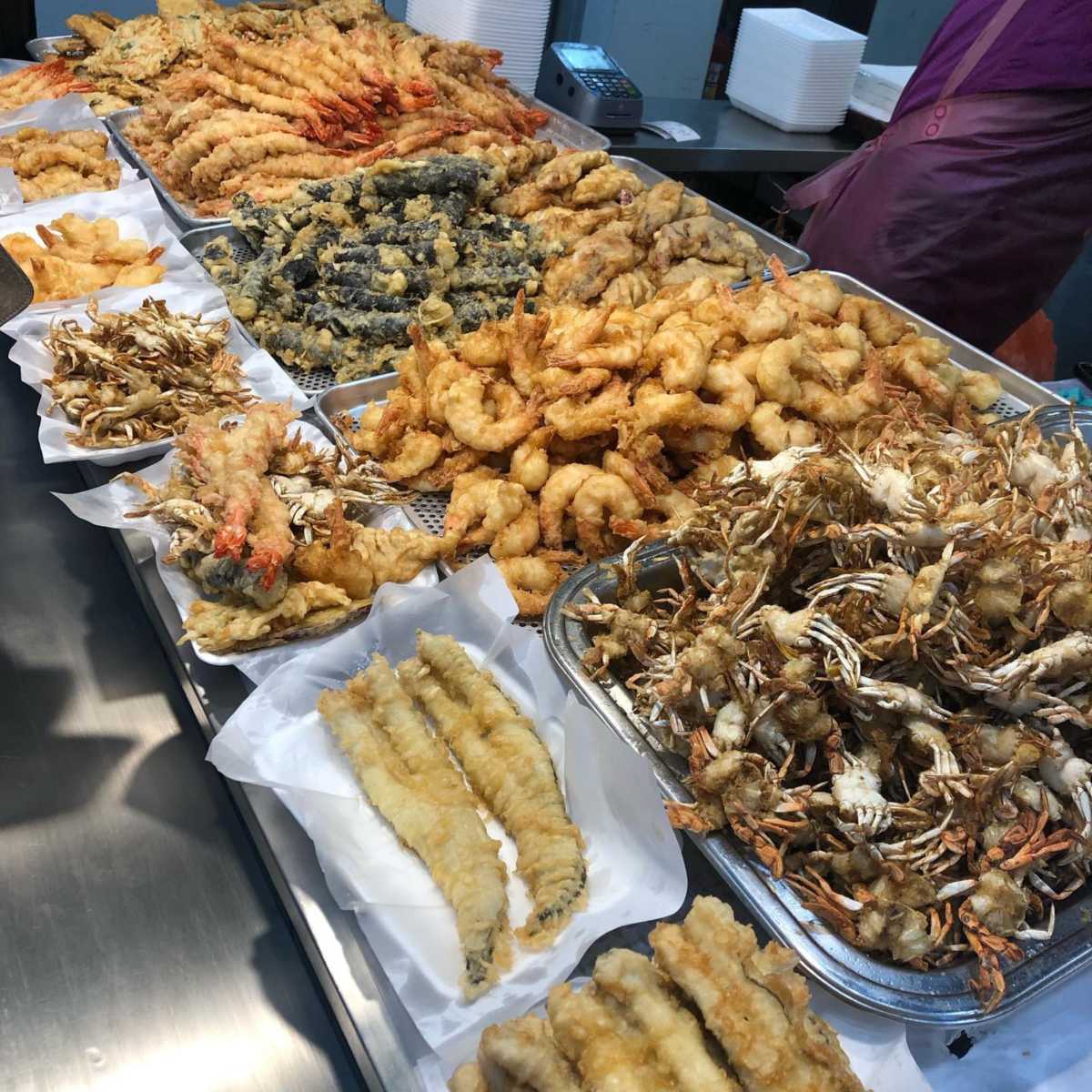 ‘삼정튀김집’은 큼지막한 크기의 튀김으로 유명한 집으로, 다른 곳에서 보기 힘든 아나고 튀김과 왕새우 튀김을 맛볼 수 있다. 튀김 종류는 야채, 고구마, 오징어, 고추, 김말이, 알새우, 아나고, 미니 크랩 등 다양하며, 주문이 들어오면 한 번 튀긴 튀김을 다시 한 번 튀겨내 바삭함을 살린다. 특히 수산시장에 위치한 만큼 해산물 튀김의 퀄리티가 뛰어나며, 신선한 재료를 큼직하게 썰어 넣어 깔끔하고 바삭하면서 속이 꽉 찬 튀김을 즐길 수 있다.