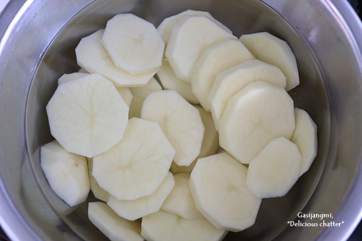 감자는 껍질을 벗겨 먹기 좋게 잘라 물에 담가 전분기를 빼주세요.
