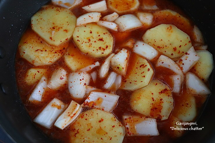전체적으로 끓어오르면 뚜껑을 덮고 2 ~ 3분 정도 감자를 익혀준 쥐