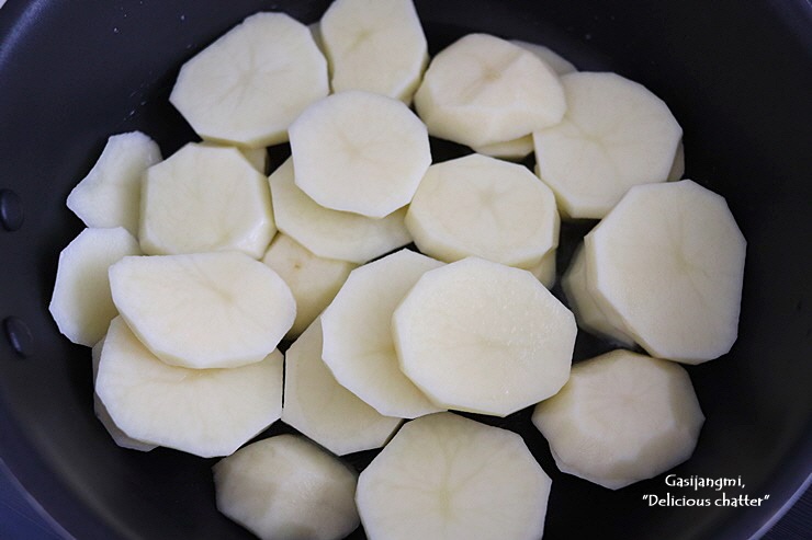 조리면서 감자를 자꾸 건들면 부서지니 팬 손잡이를 잡고 살살 흔들어줘도 좋아요.