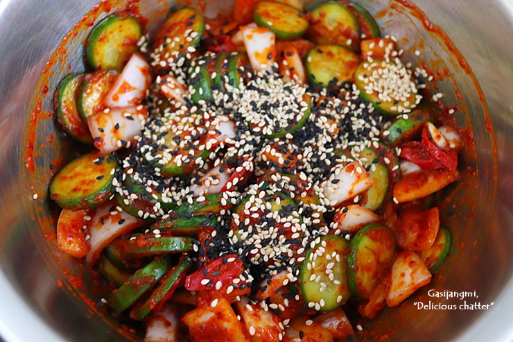 미니오이 7개, 양파 1/2개, 청양고추 1개, 홍고추 1개, 통깨 + 검은깨 적당량