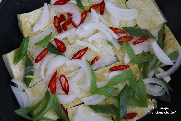 두부 1모(520g), 양파 1/2개, 대파 1/2대, 청양홍고추 2개, 오일 1큰술반, 통깨 적당량