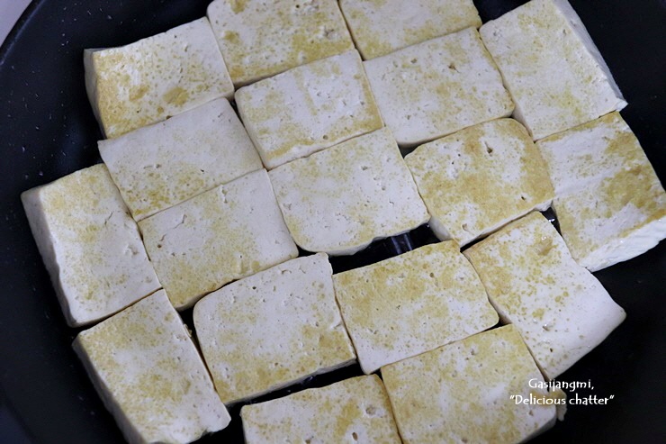 팬에 오일을 두르고 물기 제거한 두부를 올리고 앞뒤로 노릇노릇하게 구워주세요.