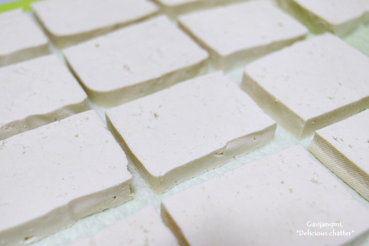두부는 먹기 좋게 잘라 키친타올에 올려 물기를 빼주세요.