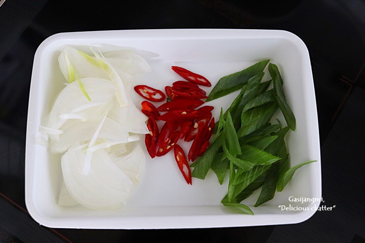 청양 홍고추와 대파는 어슷 썰어주세요.