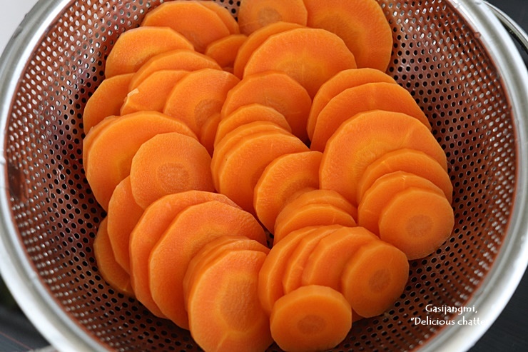 데친 당근은 찬물로 열기를 식혀준 뒤 채반에 올려 물기를 빼주세요.
