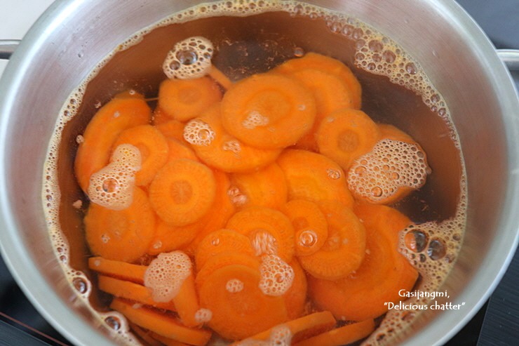 당근이 잠길 정도의 물을 끓여 소금 3꼬집정도를 넣고 풀어준 뒤