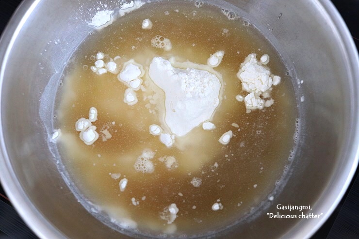 반죽 : 밀가루 150ml, 쌀튀김가루 2큰술, 국간장 1작은술, 참기름 1작은술,