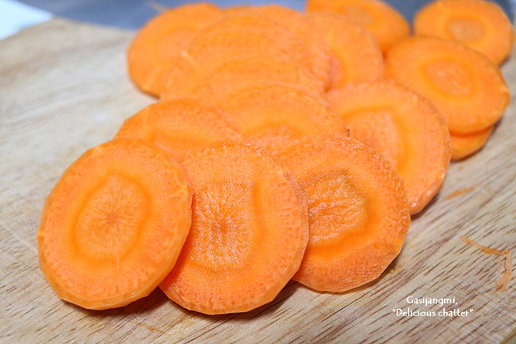 당근은 껍질을 벗기고 모양 그대로 썰어주세요.