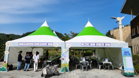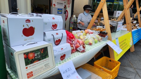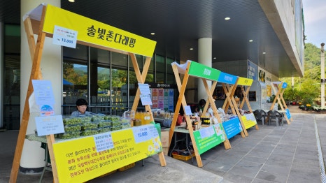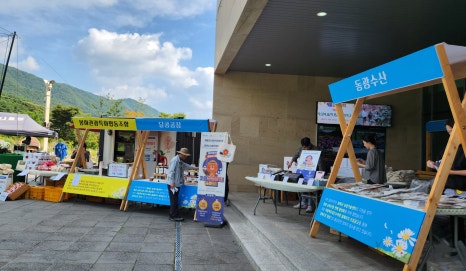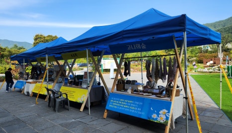 수목원 입구에는 지역 소상공인들이 참가한 플리마켓이 열려 봉화 사과, 어묵, 자연 염색 스카프 등을 판매하며, 가치상생장터 이벤트도 열고 구매자 대상으로 푸짐한 기념품도 증정하고 있으니 꼭 참여해 보시길 추천드립니다.