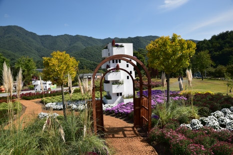 ‘국화로 그려낸 도시의 직선과 곡선’ 포토존은 국화를 색상별로 심은 모양에 따라 도시와 자연을 구분할 수 있도록 했는데요. 3동의 그린터워는 도시 속 아파트를 상징하고, 그 아래 사각형 패턴의 국화 꽃밭, 타워에 심어진 식물들은 도심 속에서도 사라진 자연을 그리워하는 소망을 표현했습니다.