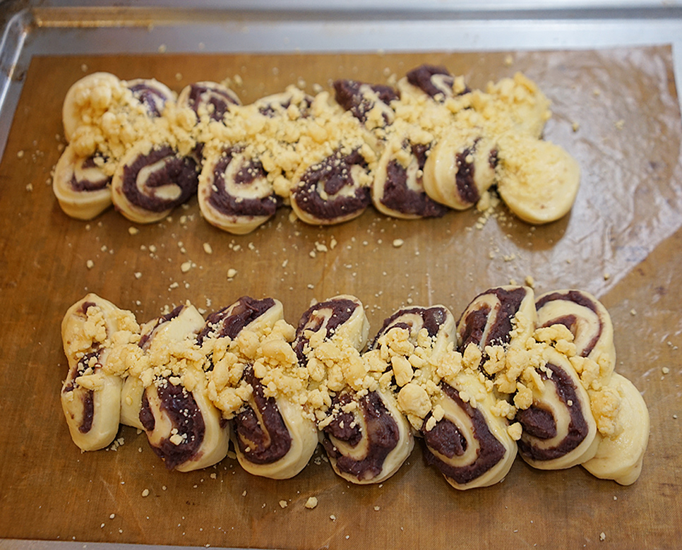 11. 달걀물을 위에 가볍게 바르고 소보로를 뿌려주세요.