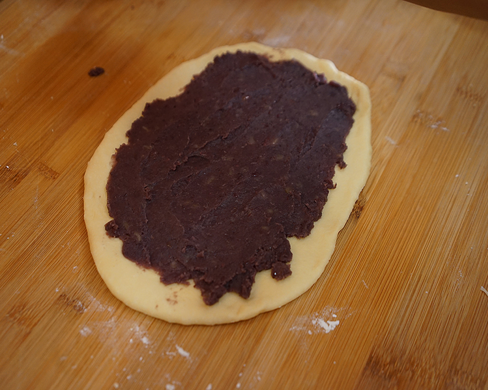 7. 반죽을 넓게 펼치고 단팥을 펼쳐 주세요.