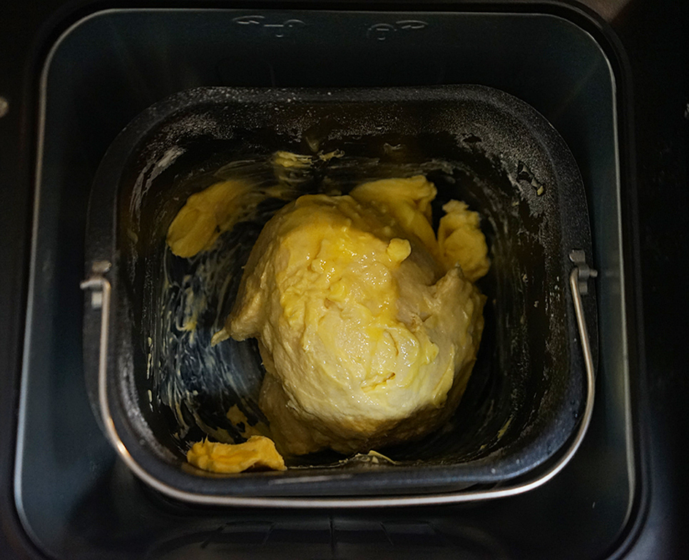 재료 : 강력분 200g, 박력분 50g, 인스턴트 드라이이스트 5g, 소금 5g, 설탕 30g, 달걀 1개, 우유 50g, 물 50g, 버터 30g