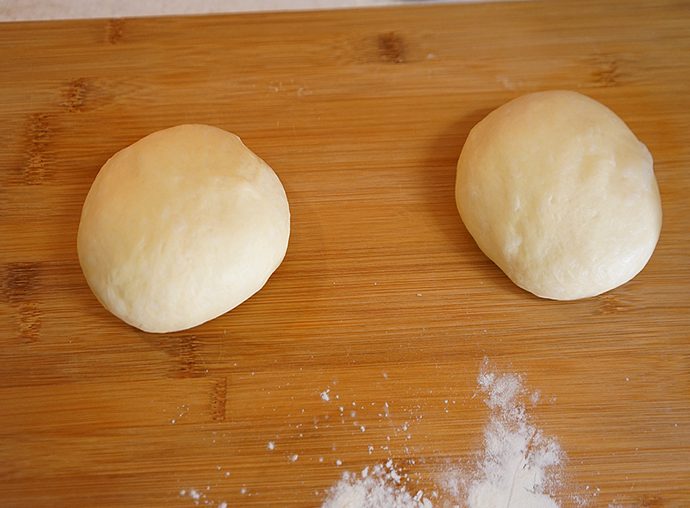 6. 1차 발효가 끝난 반죽은 반으로 나누어서 둥글리기 하고 20분 중간 발효 합니다.