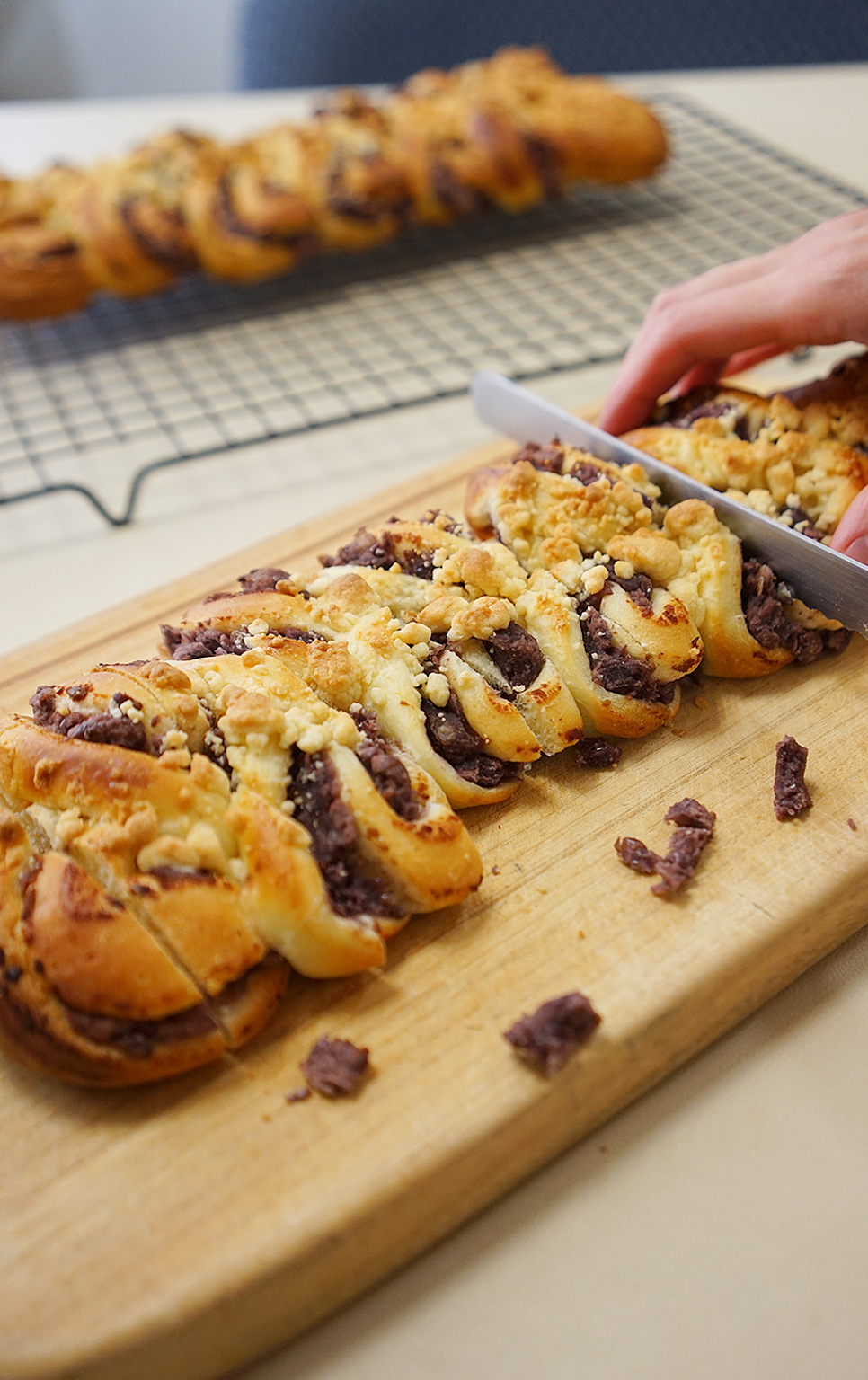 잘라서 맛있게 간식으로 먹기 좋은 빵이에요.