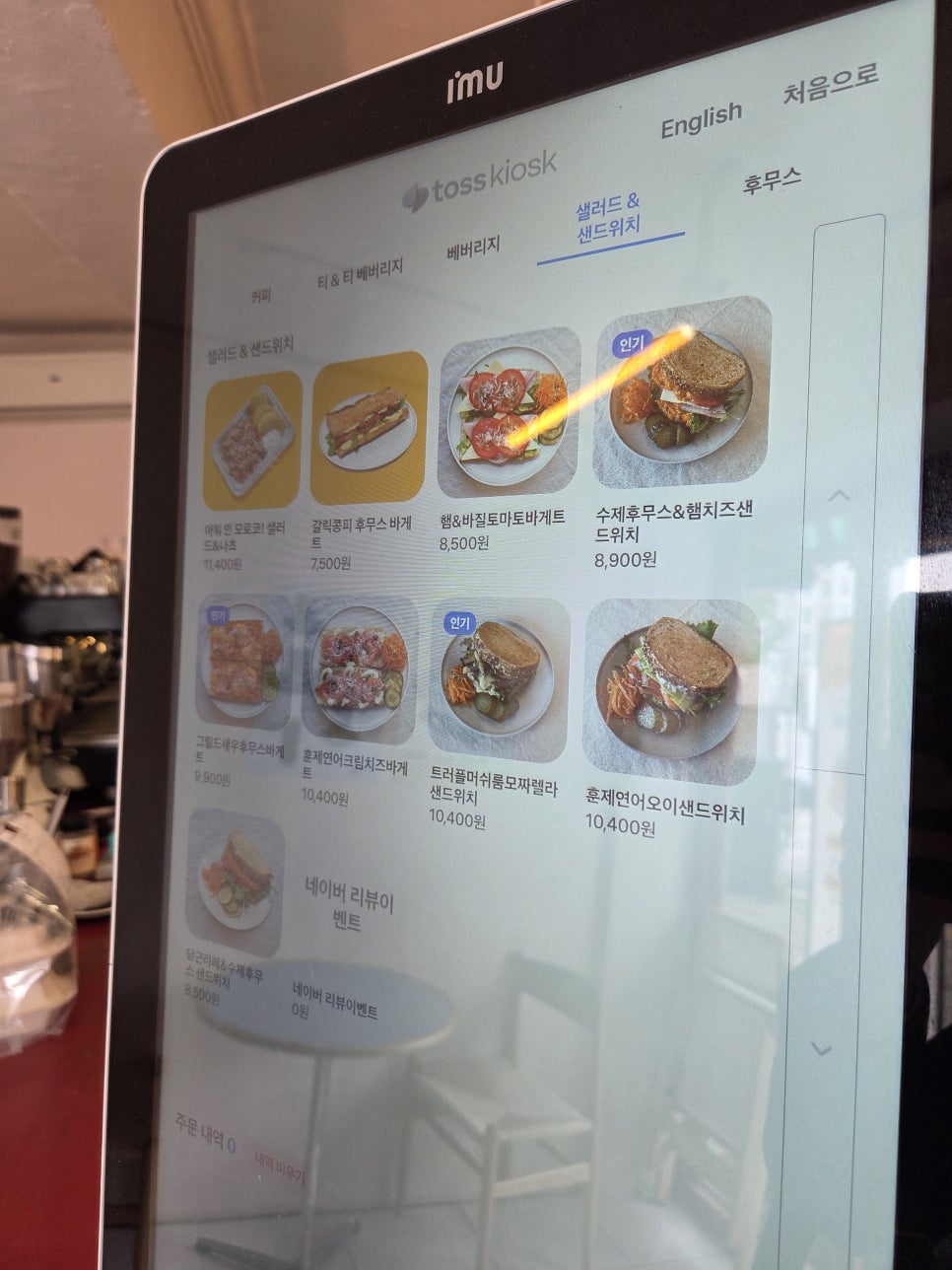 -샌드위치: 아워인모로코샐러드나쵸,갈릭콩피후무스바게트,햄바질토마토바게트,그릴드새우후무스바게트,훈제연어크림치즈바게트,트러플머쉬룸모짜렐라샌드위치,당근라페수제후무스샌드위치,훈제연어오이샌드위치,수제후무스햄치즈샌드위치