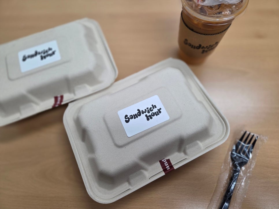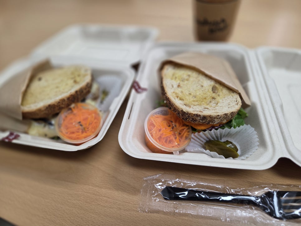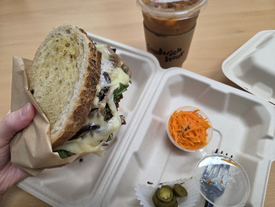 점심에 먹으려고 포장해온 「트러플머쉬룸모짜렐라샌드위치」랑 「당근라페수제후무스샌드위치」