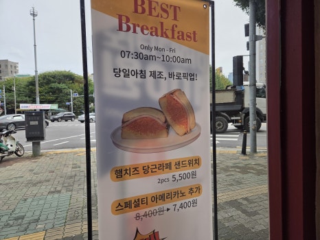 그리고, 아침메뉴로 7시30분부터 10시까지는, 햄치즈당근라페샌드위치가 5500원으로 있다는거. 가격 너무 좋은데???? 샌드위치 5500원이라니. 이 시간 방문한다면 이 메뉴 추천드립니다,,, 가성비 굿굿.