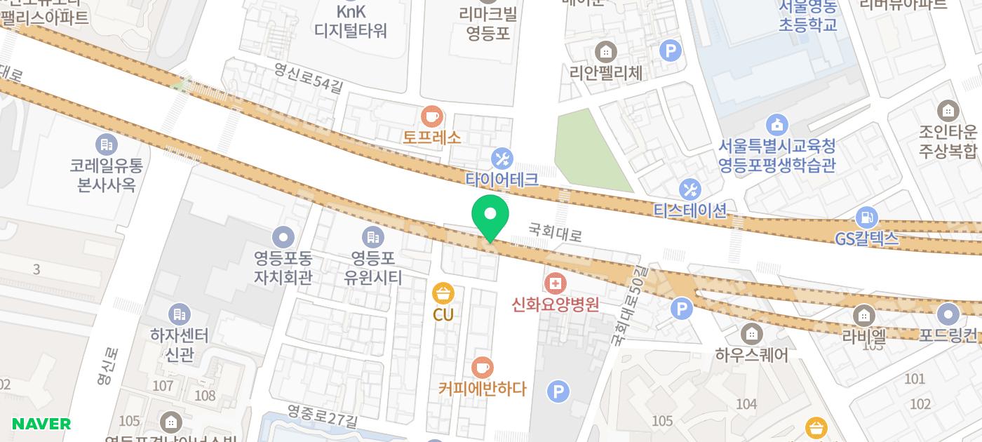 여기가 5호선 영등포시장역에서 1번 출구로 나온 다음에, 스타벅스 방향을 향해서 계속 쭉! 걸어주면 된다. 그리고 영등포전화국 사거리 모퉁이에 위치해 있는 곳을 찾으면 됨. 자차를 이용시 영등포동7가 주소 찍으면 되는데 주차할 공간은 없다. 참고하기.