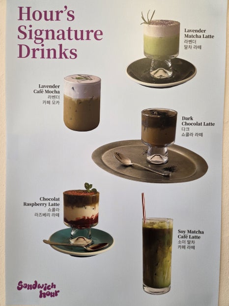 그리고, 샌드위치아워시그니처음료는, 라벤더말차라떼,라벤더카페모카,다크쇼콜라라떼,쇼콜라라즈베리라떼,소이말차카페라떼.