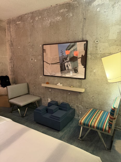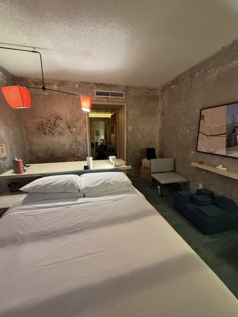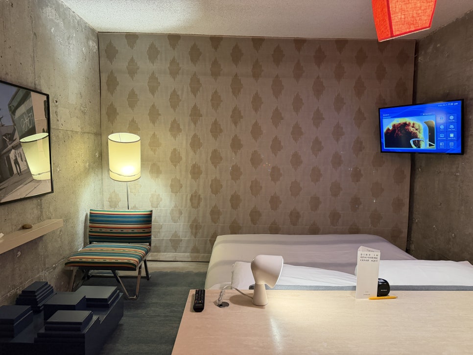 객실은 감각적이고 톡톡 튀는 포인트 컬러가 돋보이는 인테리어로 꾸며져 젊은 세대의 취향을 저격할 것으로 보인다. 힙한 LA의 분위기와 참 잘 어울린다는 생각이 들었다. 크기가 큰 편은 아니지만 긴 테이블에 킹사이즈 침대, 간이 식탁까지 갖출 건 다 갖췄다.