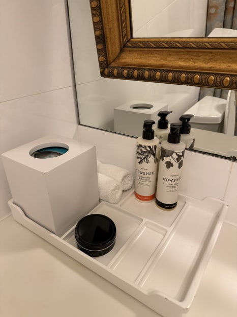 욕실 어메니티는 샴푸, 컨디셔너, 바디 워시, 핸드워시, 바디로션, 객실슬리퍼 및 가운 등이 구비돼 있다. 칫솔 치약은 프론트에 요청하면 상황에 따라 받을 수 있는데 따로 가져올 것을 권한다.