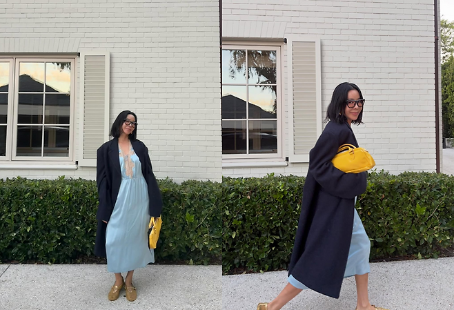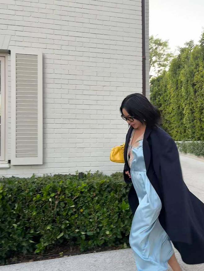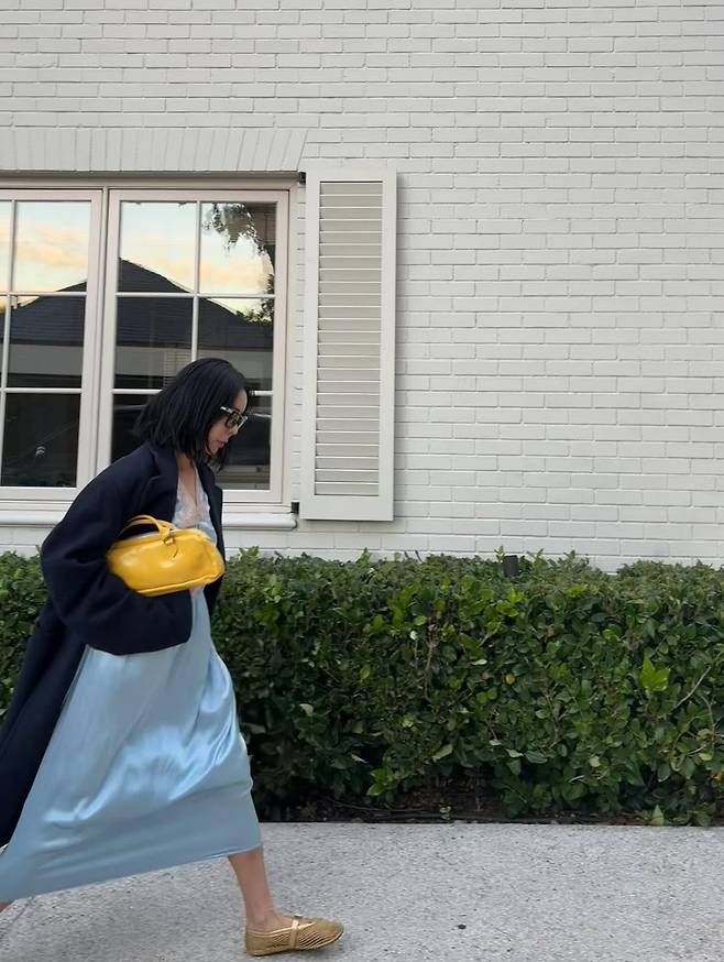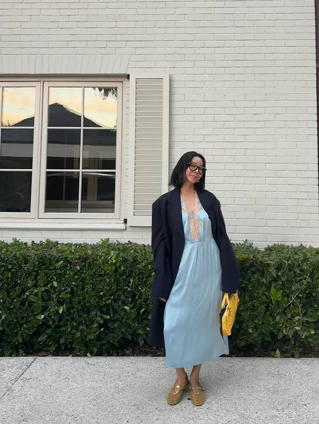 사진 속 그는 아무나 소화하기 힘든 하늘색 실크 드레스를 잠옷처럼 보이지 않게, 오히려 우아하게 연출했다.